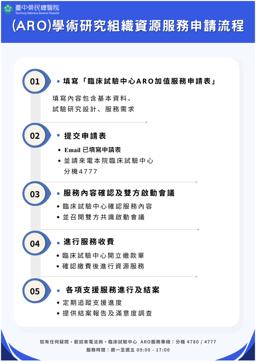 為強化中榮與生醫產業、製藥研發及醫療器材廠商之合作緊密度,臺中榮總臨床試驗中心提供學術研究組織ARO服務申請,